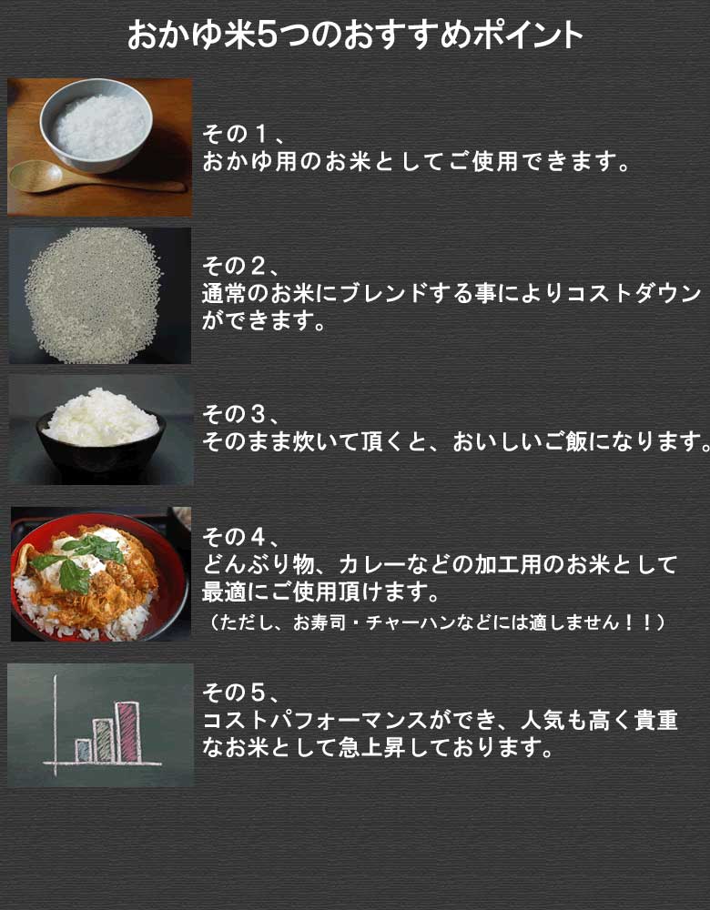 HOMEProduct Listわけあり おかゆ米 わけあり おかゆ米 わけあり おかゆ米 米の食味比較米の生産比較 おかゆ米 (okm01) 商品説明 : 商品名-コストダウンに最適 おかゆ米 精米容量-5Kg・10Kg おすすめ度★★★★☆ 人気の秘密 会社・飲食店様の業務用米としても人気が高く、大量出荷に対応してます。
